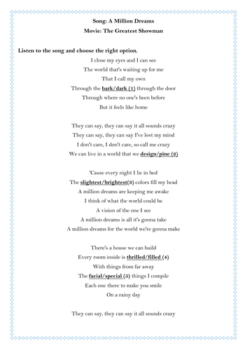 A Million Dreams Song Activity English Esl Worksheets For Distance Learning And Physical Classrooms