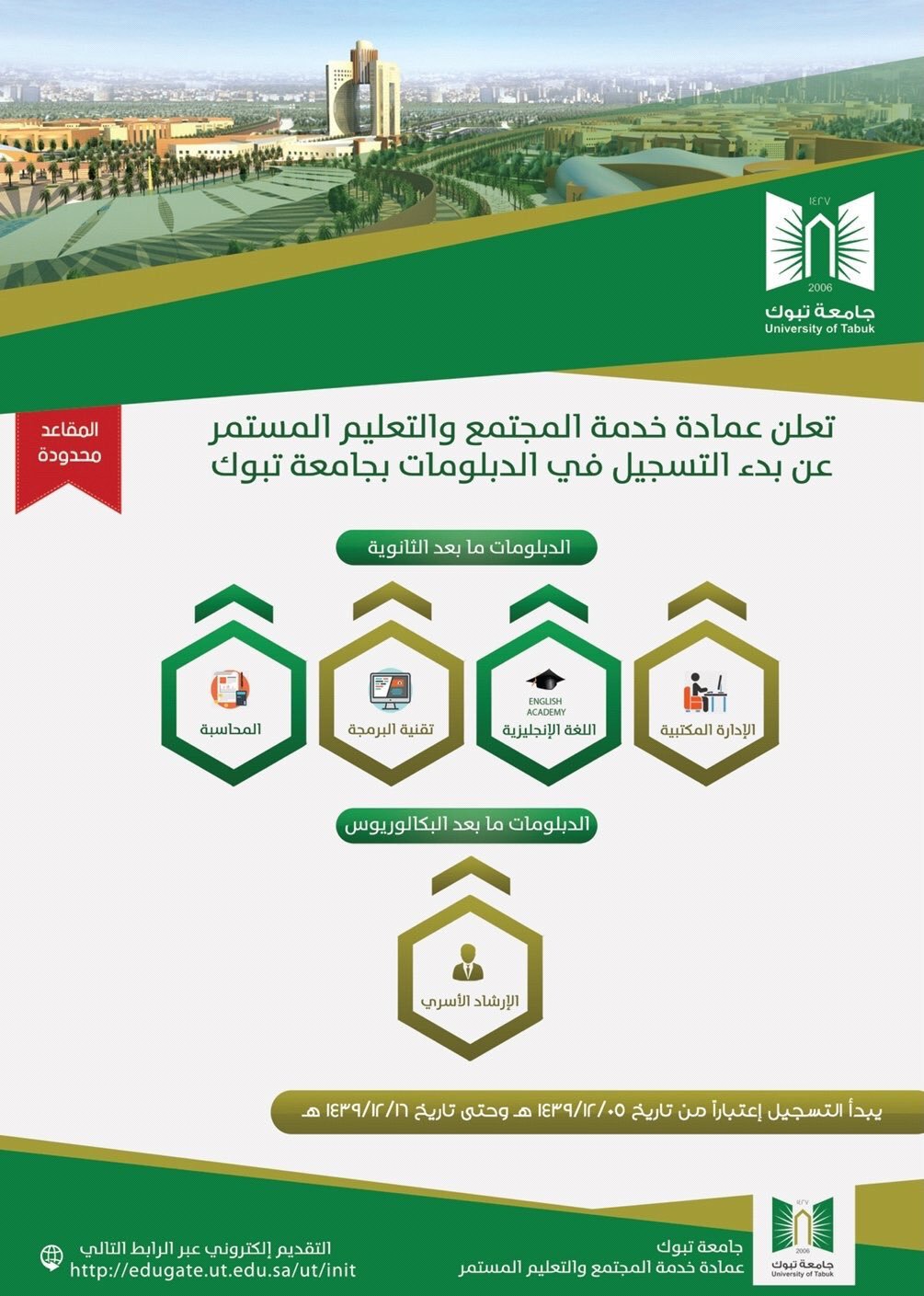 جامعة تبوك On Twitter تعلن جامعة تبوك ممثلة في عمادة الدراسات العليا عن فتح باب التقديم الإلكتروني في برامج الماجستير للعام الجامعي 1439هـ 1440هـ حيث سيبدأ استقبال الطلبات ابتداء من يوم الأحد الموافق18 5 1439هـ وحتى يوم الخميس